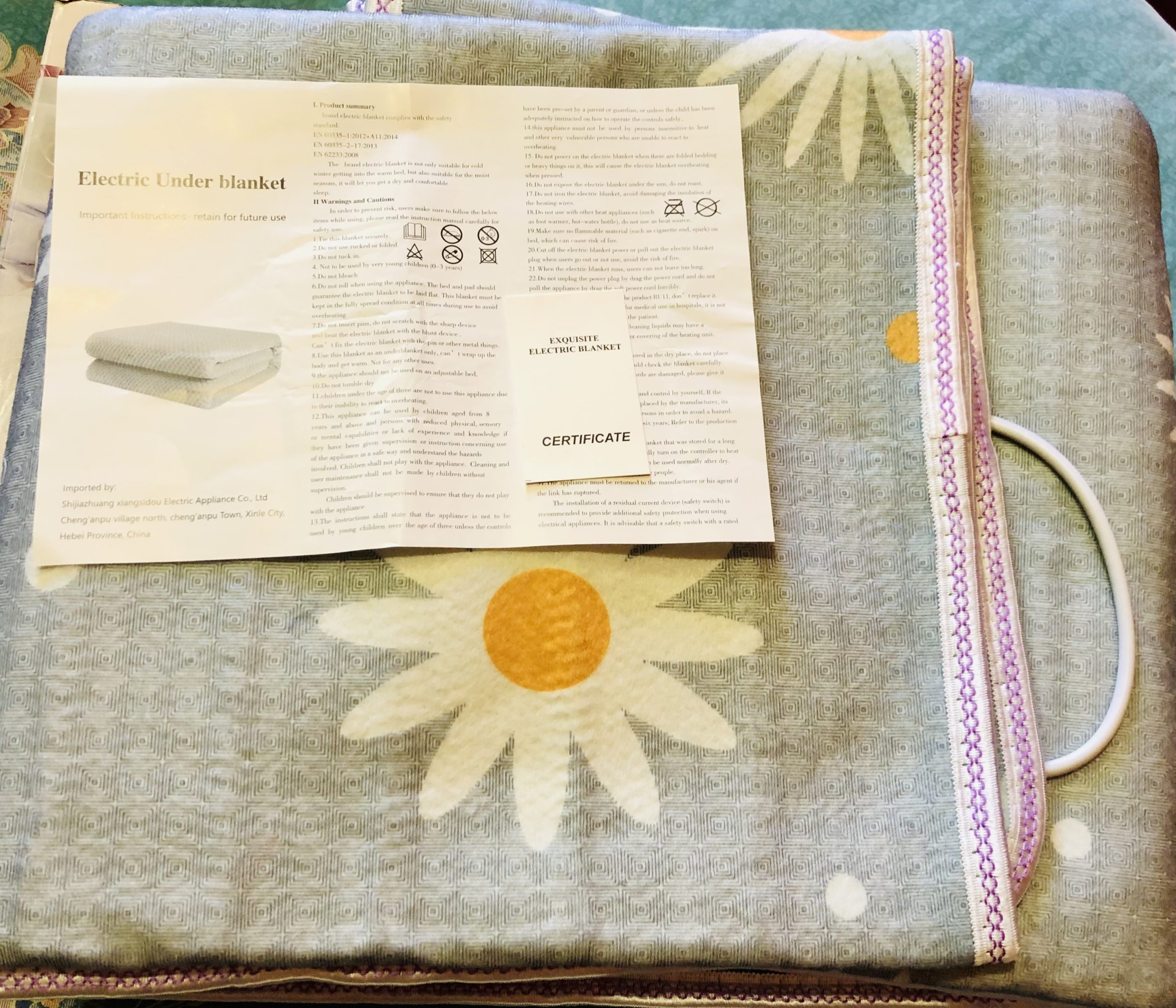 Machine washable under controller removal. The blanket’s service life is up to six years, with instructions to inspect and air the product out after storage for continued safety.